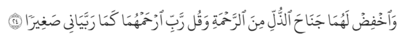Which means: “And lower to them the wing of humility out of mercy and say, ‘My Lord, have mercy upon them as they brought me up (when I was) small.”