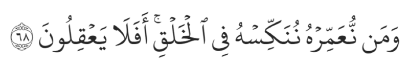 Which means: “And whomever We grant a long life, We reverse him in creation (to a state of weakness). Do they not then reflect?”