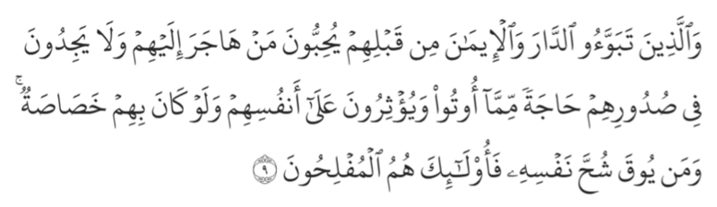 Which means: “As for those (Ansar - helpers) who had settled in the city (Madinah) and embraced the faith before them (the Muhajirun - emigrants) they love whoever immigrates to them, never having a desire in their hearts for whatever of the gains is given to them (to the Muhajirun). They give (the Muhajirun) preference over themselves even though they may be in need. And whoever is saved from the selfishness of their own souls, it is they who are truly successful.”