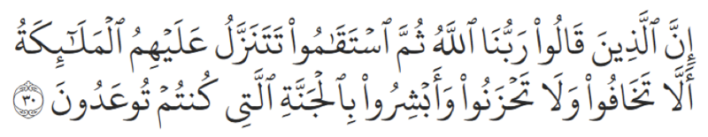 “Sesungguhnya orang-orang yang berkata, ‘Tuhan kami ialah Allah,’ kemudian mereka beristiqamah, para malaikat akan turun kepada mereka dengan membawa ketenangan (dan berkata) ‘jangan kamu takut, jangan kamu bersedih, dan bergembiralah dengan syurga yang dijanjikan.’”