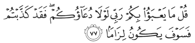 Which means: “Say: ‘My Lord would not concern Himself with you if not for your supplication. But you have denied Him, and the punishment will inevitably befall you.’”